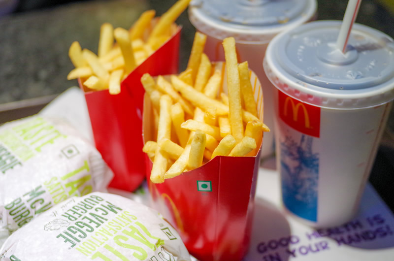 投稿日: 2013年3月15日2020年1月4日 投稿者: てんちょーインドのマクドナルド 日本ではほとんど行かないマクドナルドですが、インドのマクドナルドにはベジタリアンメニューがあるというので、興味本位で初めて行ってきました♪(ニューデリー :コンノートプレイス) 頼んだのは、バリューセット。 バーガーは辛くないカレー味のコロッケがはさんでありました。 やっぱりカレー味が好きなのねっ (^O^)