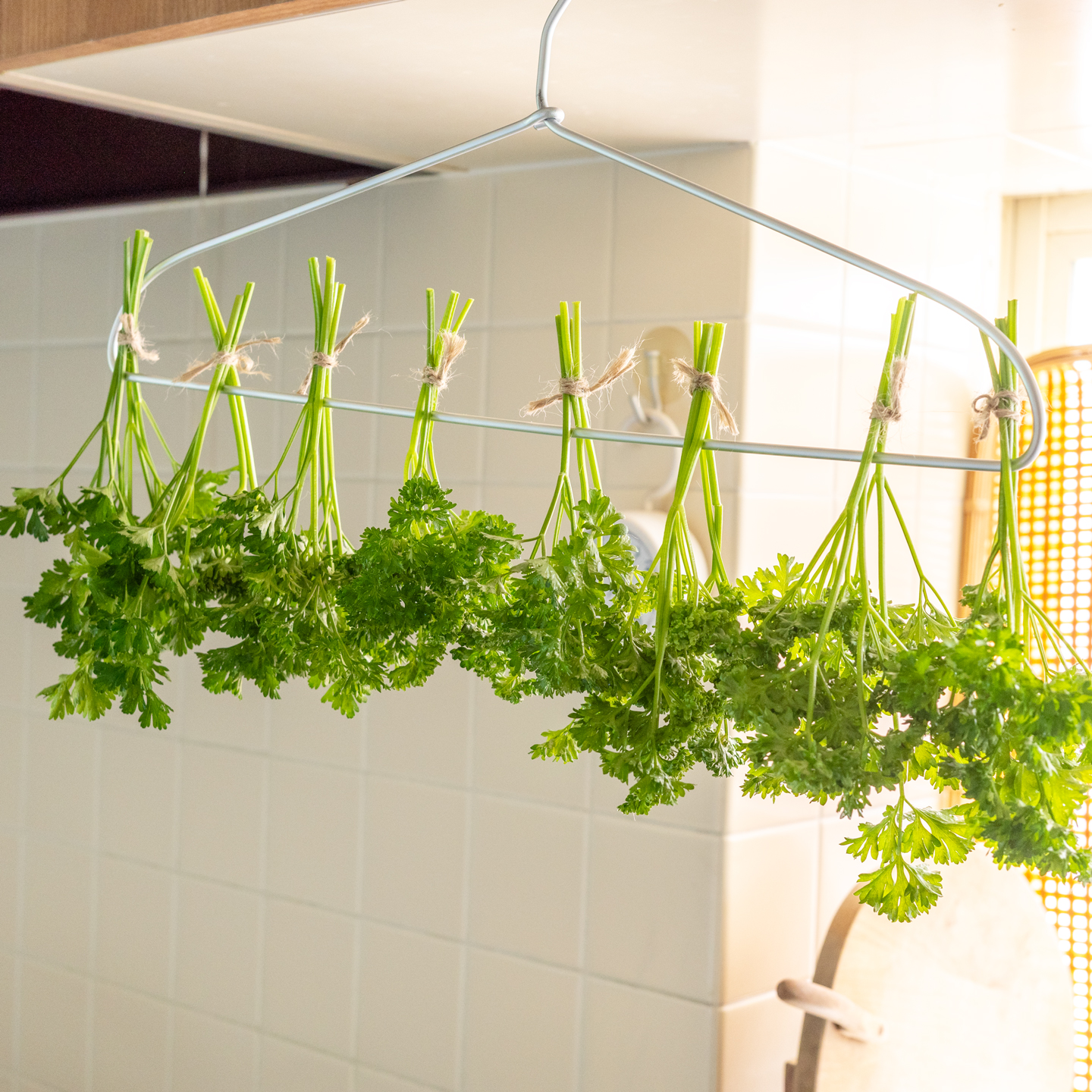 投稿日: 2025年7月31日2025年7月31日 投稿者: てんちょー乾燥パセリ わっさわっさ穫れるパセリそんなにむしゃむしゃ食べれるもんじゃないし、どーしよって思ってましたが、「そーだ、乾燥パセリを作ればもう買わなくていいのでは」って思いつき、しばらくハンガーに干してカラカラに乾燥させてみることに。上手くいけばいいな〜