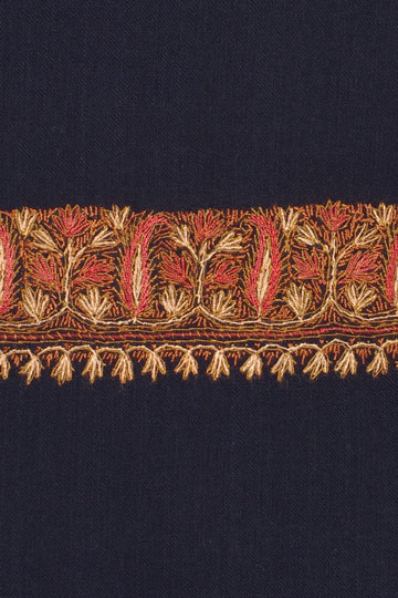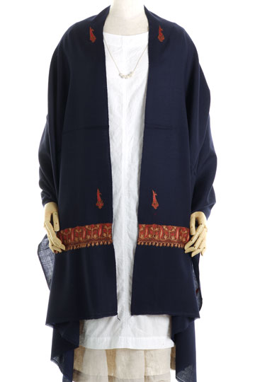 また、このストールは、生地の両面から、二重に手針刺繍が施されたリバーシブル・タイプですので、それぞれの面で違う刺繍の色合いが楽しめます。