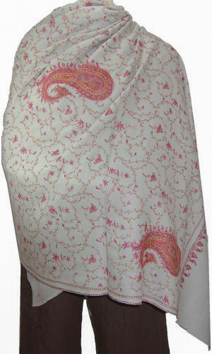 柔らかな薄手のカシミールウール(ヤギの冬毛)の生地に、細かな手針刺繍が施されたショールです。