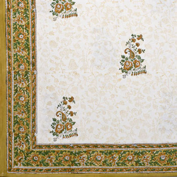 このテーブルクロスは、インド綿の生地に上品で繊細なデザインが何重にもブロックプリント(木版版画)された高級テーブルクロス(マルチカバー)です。