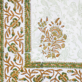 このテーブルクロスは、インド綿の生地に上品で繊細なデザインが何重にもブロックプリント(木版版画)された高級テーブルクロス(マルチカバー)です。