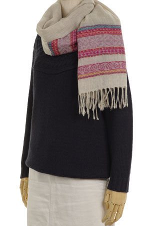 この商品は、染色していないナチュラルなウール生地に、カラフルな糸でストライプのデザインが織り込まれた素敵なウールストールです。